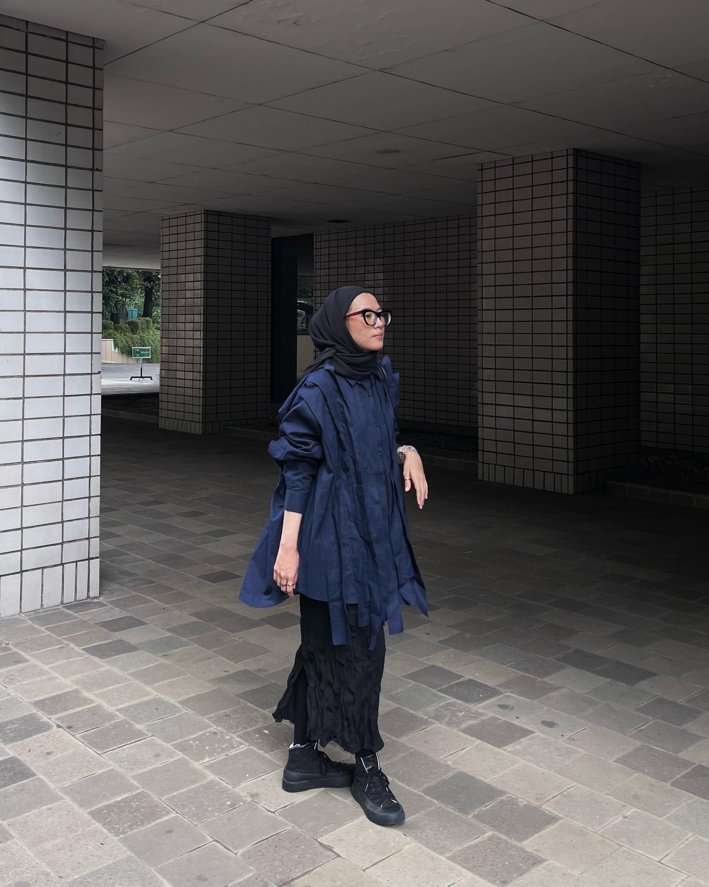 Apakah benar warna navy cocok dengan warna apa pun kecuali warna hitam? Siapa bilang biru dongker kurang menarik jika dijodohkan dengan hitam? Tidak sama sekali kok, Hijab Bae!